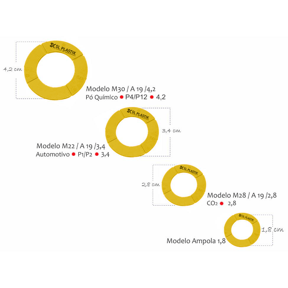 Modelo SL19 produzidos em polipropileno, tipo Anel. Lacre para extintor de incendio, conforme Portaria Nº 412, de 24 de outubro de 2011, norma que regulamenta as cores dos aneis. 2,8 / 3,4 / 4,2.